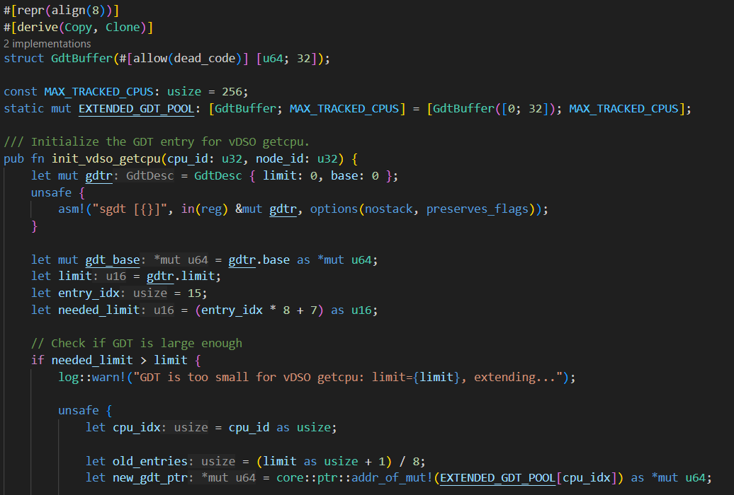 - 修改了 x86 架构 getcpu 的初始化实现 为每个 cpu 分配独立 GDT 空间 解决多核场景下 CPU ID 获取不准确的问题